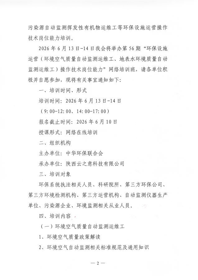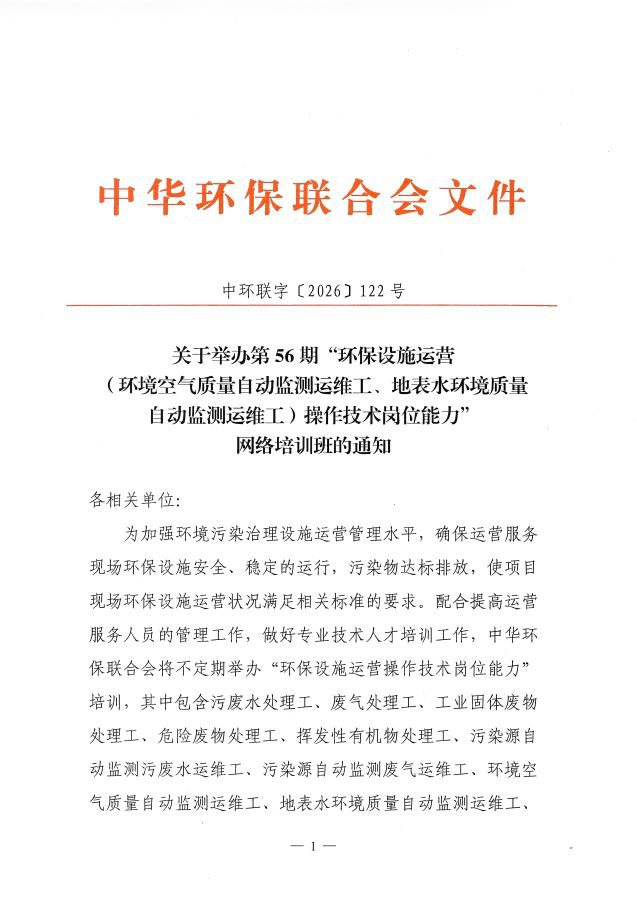 关于举办第56期“环保设施运营(环境空气质量自动监测运维工、地表水环境质量自动监测运维工)操作技术岗位能力”网络培训班的通知