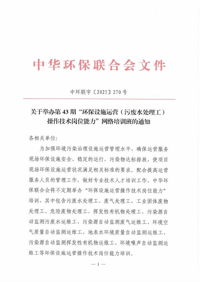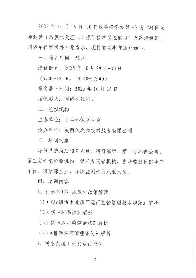 关于举办第43期“环保设施运营(污废水处理工)操作技术岗位能力”网络培训班的通知