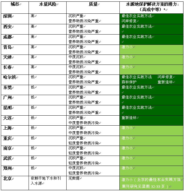 《蓝图》认为,全球四分之一的城市都可从水源地保护投资中获得良好的投资回报率。中国17个主要城市中有8个在这一方面具有较高或中等潜力,可通过采用最佳农业实践方法、河岸修复、森林保护和重新造林等保护战略,大幅提高水资源的质量。这些战略能够将沉积和营养物质污染降低10%,进而使水治理的平均成本减少5%。